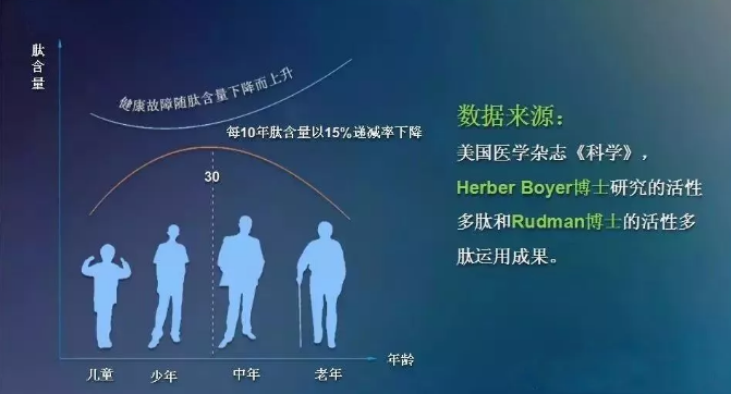 但当体内的肽不足、活性降低时,就无力抑制、修复受损病变细胞,时间久了,伴随而来的就是疾病和衰老。另外,肽在体内的数量和活性并不是一成不变的,30岁以后肽在体内的分泌量及活性就会逐渐下降,因此,要想改善慢性病、延缓衰老,就必须及时补充外源性肽。