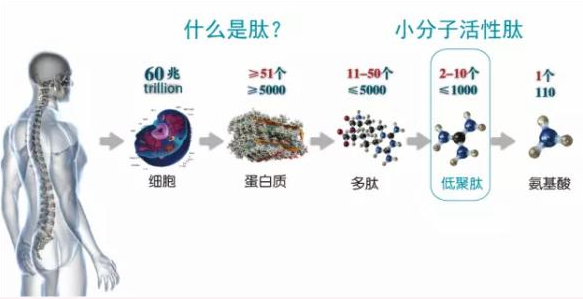 肽是活性氨基酸库,这表明肽是氨基酸的载体。以氨基酸数量来划分,可分为小分子肽和多肽,三个氨基酸组成的家三肽,依此类推四肽、五肽直到十肽,十个以下的称小分子肽,十个以上的称为多肽(数量不是十分严格的)。例如:MT活力肽就是一组小分子肽,而胰岛素就是由51个氨基酸分子组成的多肽。活性肽是蛋白质和氨基酸发挥作用的活性基因部分,也是人体蛋白质发挥作用的唯一途径。